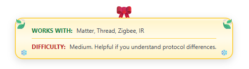 Before buying anything in this section, confirm: Do they use Home Assistant or Homey or something else? Do they prefer Zigbee or Z-Wave or Thread? Do they want a project or a product? The answers determine everything. And remember: for these people, the “gift” might not be the device itself. It might be the excuse to spend a weekend configuring it.