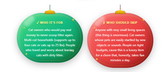When your cat finishes using the box, the dome tilts, waste separates from clean litter, and everything resets for the next visit. We set it up in our office and the moment we got the first “your cat used the litter box” notification was almost moving. The convenience factor is sky high. No more scooping, no more scrubbing, the worst pet parent chore becomes completely hands-off. After a few weeks of testing: cats adapted quickly, the operation is quiet enough for bathrooms, and odor control works well. The sealed waste bin traps smells effectively.