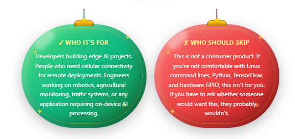 Combines a Qualcomm Dragonwing SoC with a 12 TOPS AI accelerator. That’s roughly three times more powerful than a Coral TPU. Add 5G cellular connectivity, Wi-Fi 6E, and Raspberry Pi-compatible GPIO pins, and you have hardware designed for serious edge AI work. Our embedded team got excited when we saw it. The 12 TOPS NPU makes it a potential candidate for projects like Frigate, and Particle mentioned they’d love to support that integration.