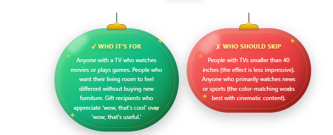 Those with TVs mounted in very bright rooms, because the effect needs some darkness to shine. This is a light strip for the back of your TV that watches what’s on screen and changes colors to match. During movie explosions your wall goes orange, and forest scenes wash the room in green. It’s the kind of thing you don’t realize you want until you see it in action. The old version required corner brackets and careful measurement, and you’d spend twenty minutes making sure angles were perfect.